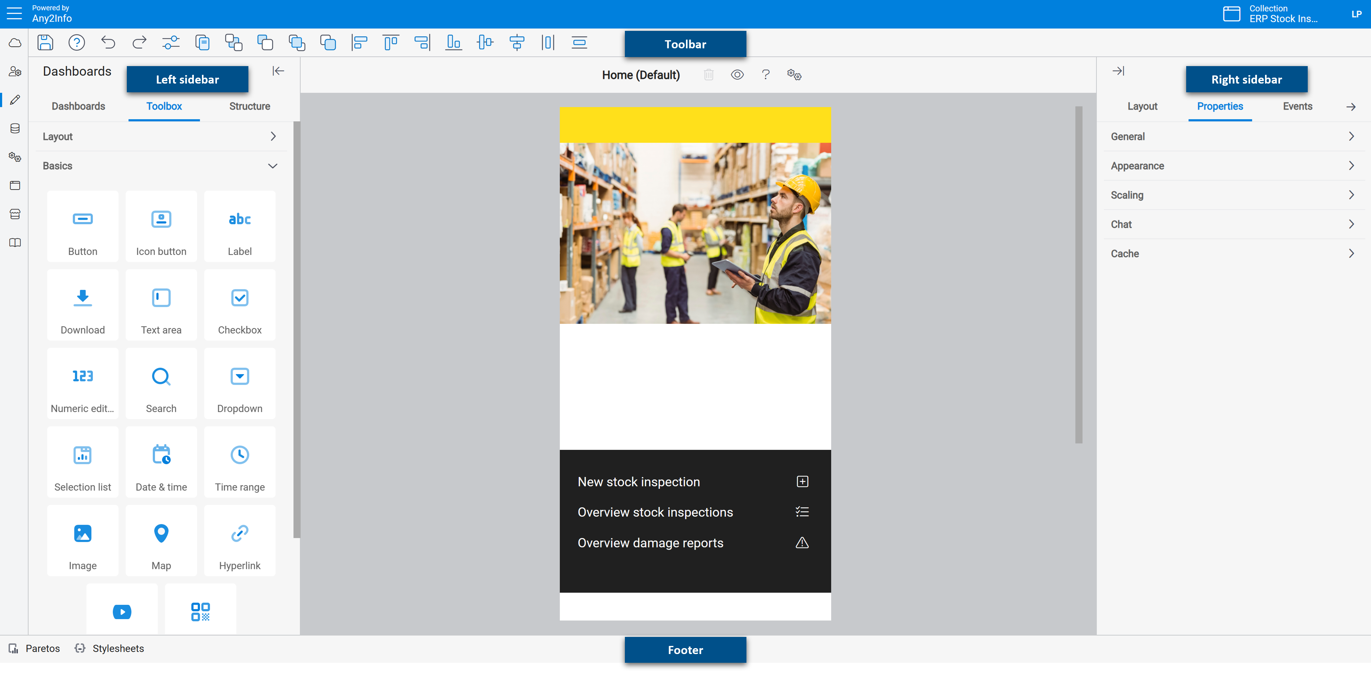 In all cases, the composition of the work takes place visually on a central work surface, called [**canvas**](https://academy.any2info.com/any2info-academy/no-code-platform/app-studio/designertools/canvas)**,** with functions on the [**toolbar**](https://academy.any2info.com/any2info-academy/no-code-platform/app-studio/designertools/toolbar), the [**left sidebar**](https://academy.any2info.com/any2info-academy/no-code-platform/app-studio/designertools/left-sidebar), the [**right sidebar**](https://academy.any2info.com/any2info-academy/no-code-platform/app-studio/designertools/right-sidebar) and in the [**footer**](https://academy.any2info.com/any2info-academy/no-code-platform/app-studio/designertools/footer-functions) of the designer screen.