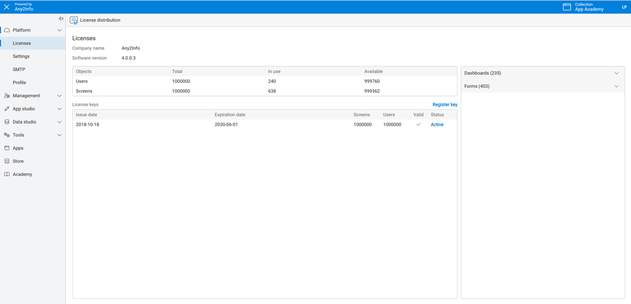 Any2info or your IT partner will be able to provide you with a license key in time. The key is **valid for an agreed period** and must be **renewed at the end of this period**. Check in time in the menu under Platform - Management whether you have a valid license.